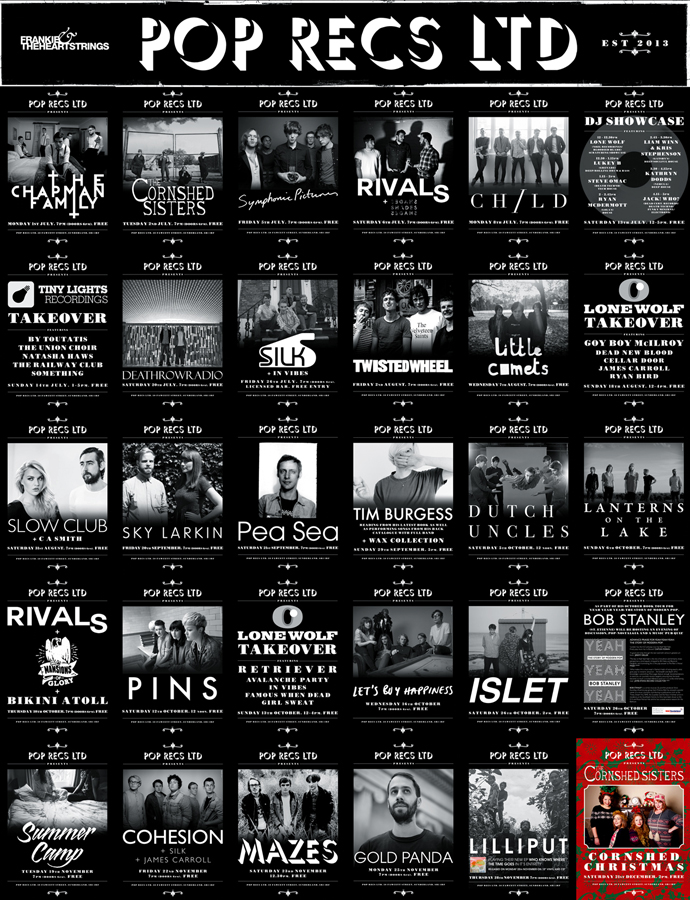 Shop signage and 2013 events posters for Frankie & The Heartstrings' Sunderland shop, POP RECS LTD.