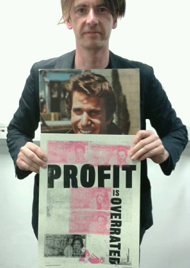 Bernard Butler (and The Fonz) with the 'Profit Is Overrated' limited edition screen print designed for Frankie & The Heartstrings. Pop Recs Ltd, 07.06.13. Photo by Paul Alton.