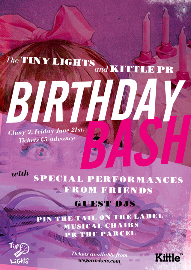 Poster design for Tiny Lights/Kittle PR joint 'Birthday Bash'.