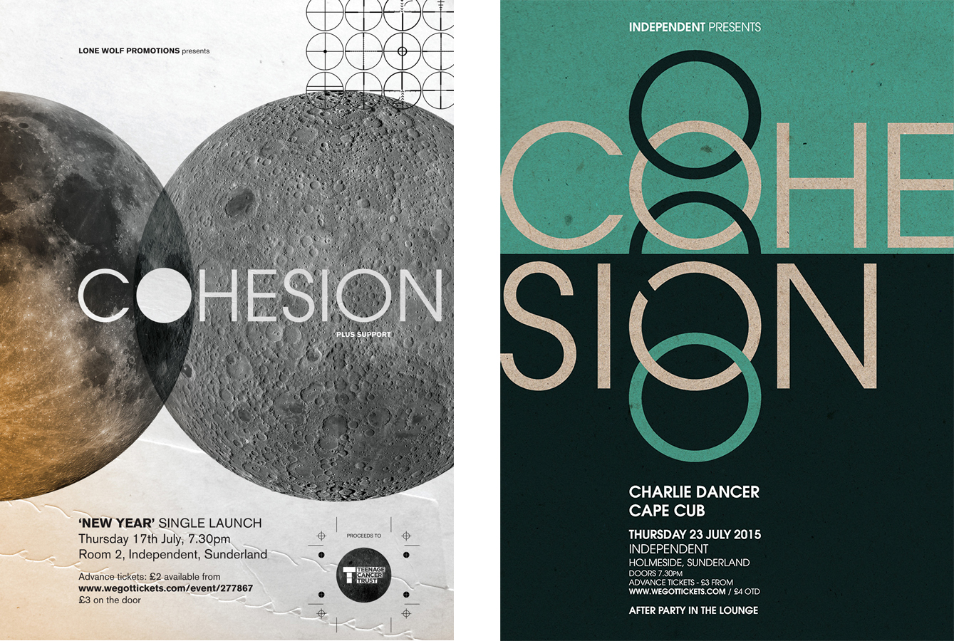 2014 and 2015 poster designs for Cohesion's headline hometown shows at Independent, Sunderland.