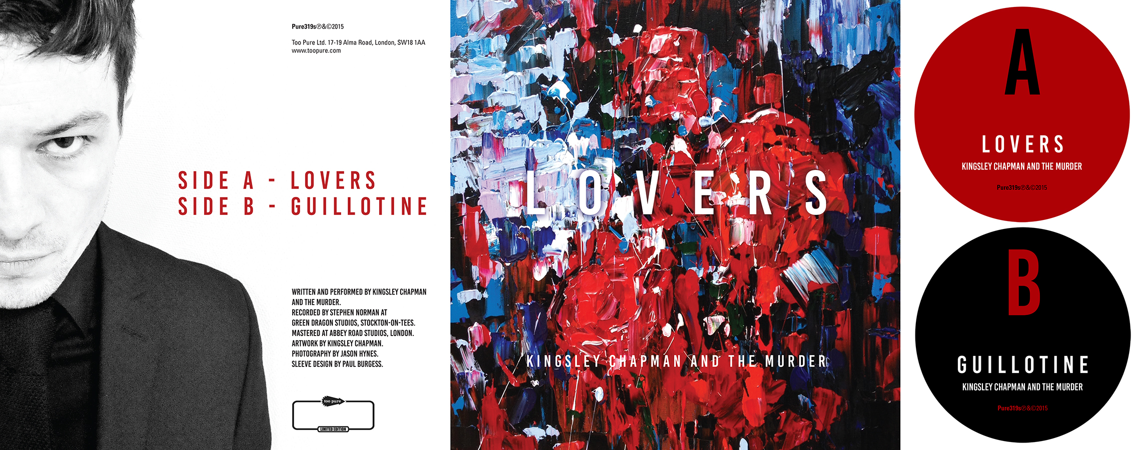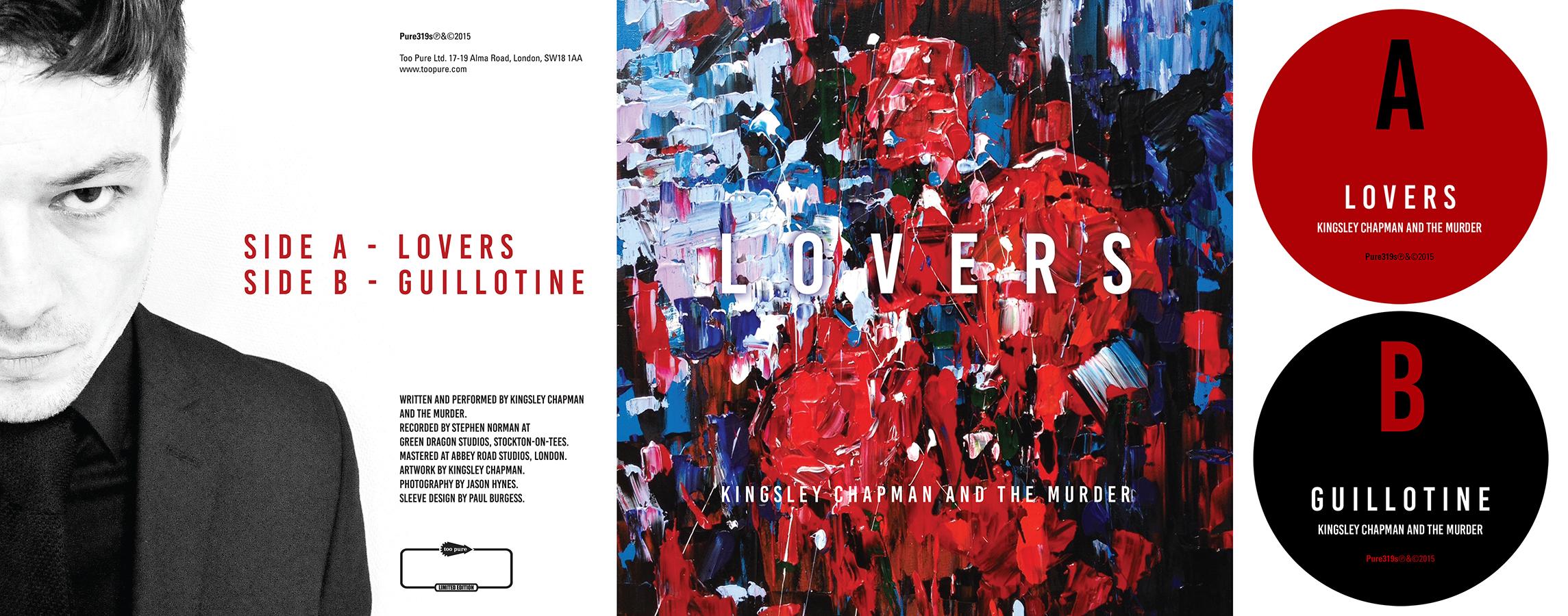 Sleeve/label artwork for Kingsley Chapman and the Murder's limited edition debut 7" single 'Lovers' (Too Pure 2015).
