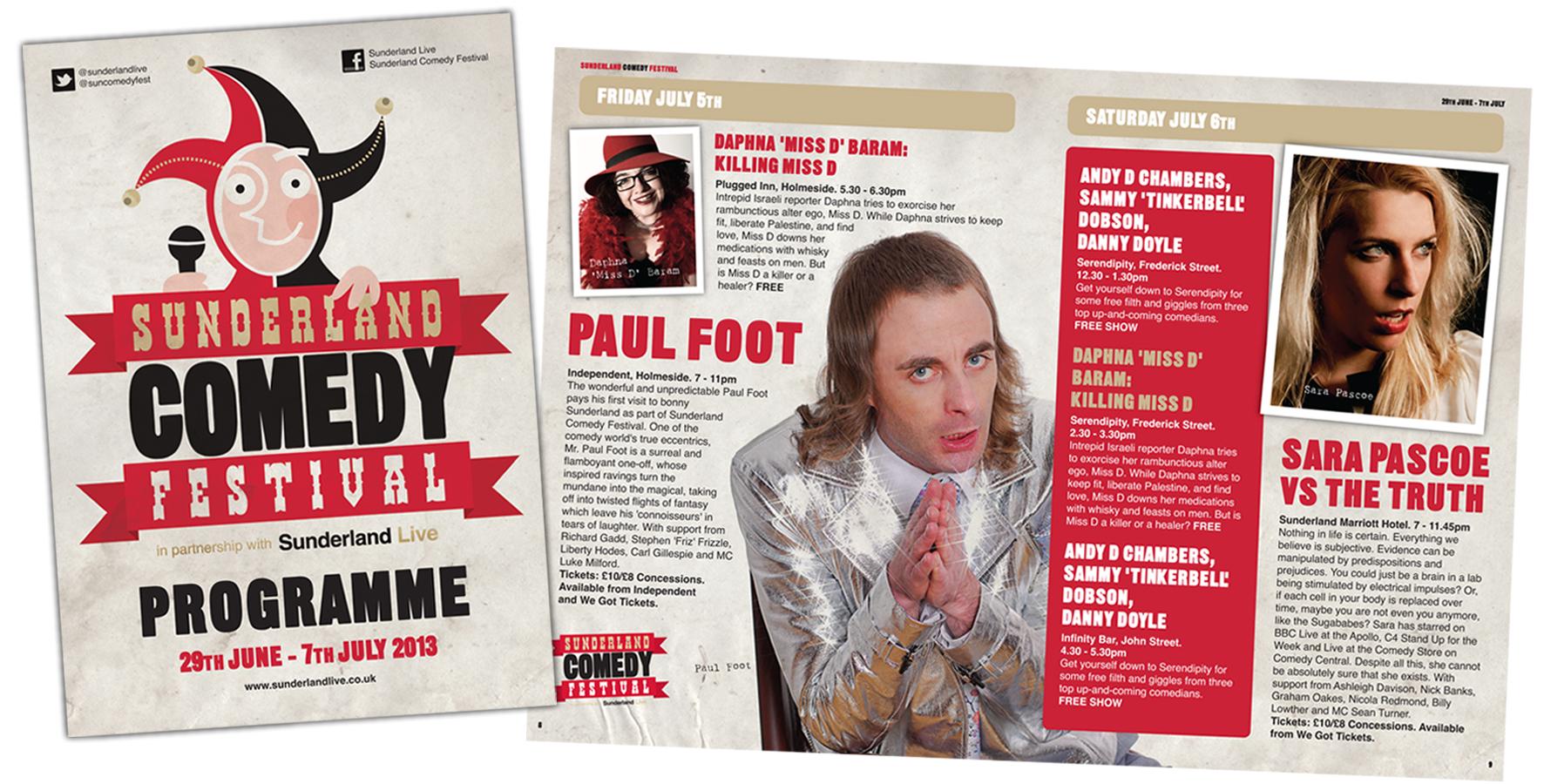 Part of a range of publicity material, including branding, posters, flyers and large format display for Sunderland's first ever comedy festival.